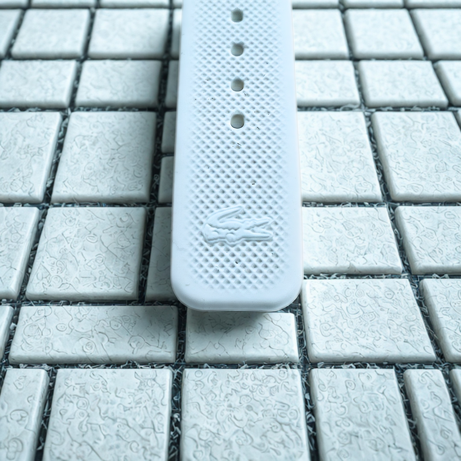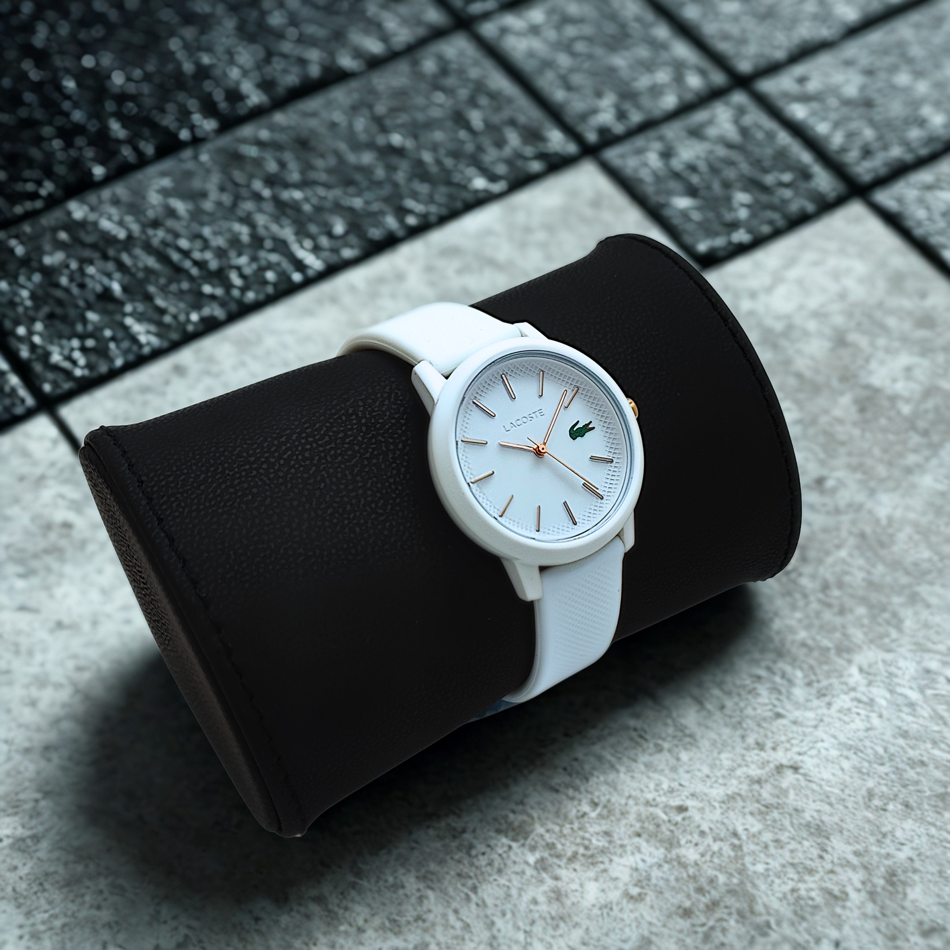 The Lacoste Women’s Watch 2001211 stands out with its modern, sporty-elegant design. Featuring a white case and strap, it’s a versatile accessory that suits any outfit – whether casual during the day or chic in the evening. The dial is minimalistic with sleek hour markers and the iconic green crocodile logo at 3 o’clock as a signature highlight.