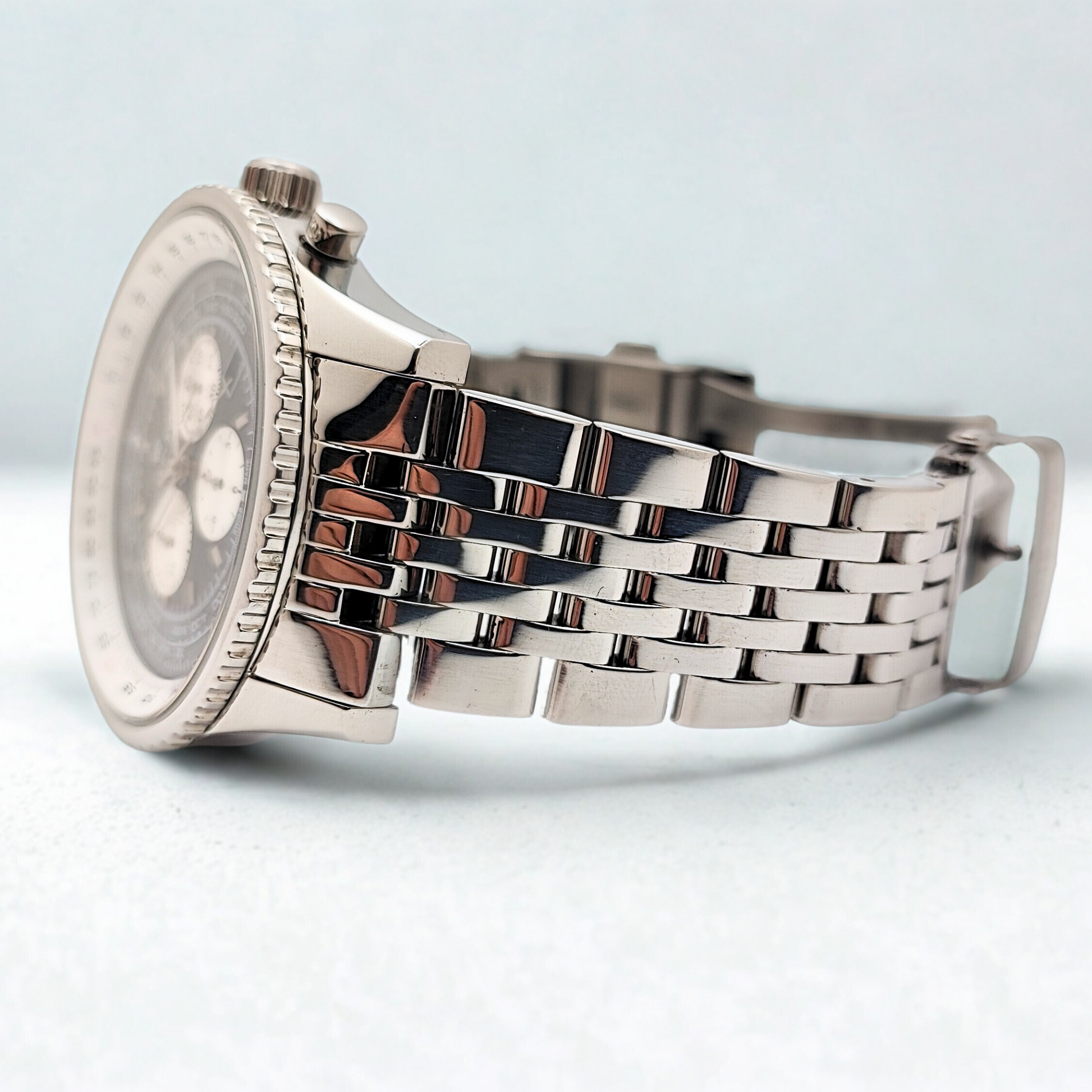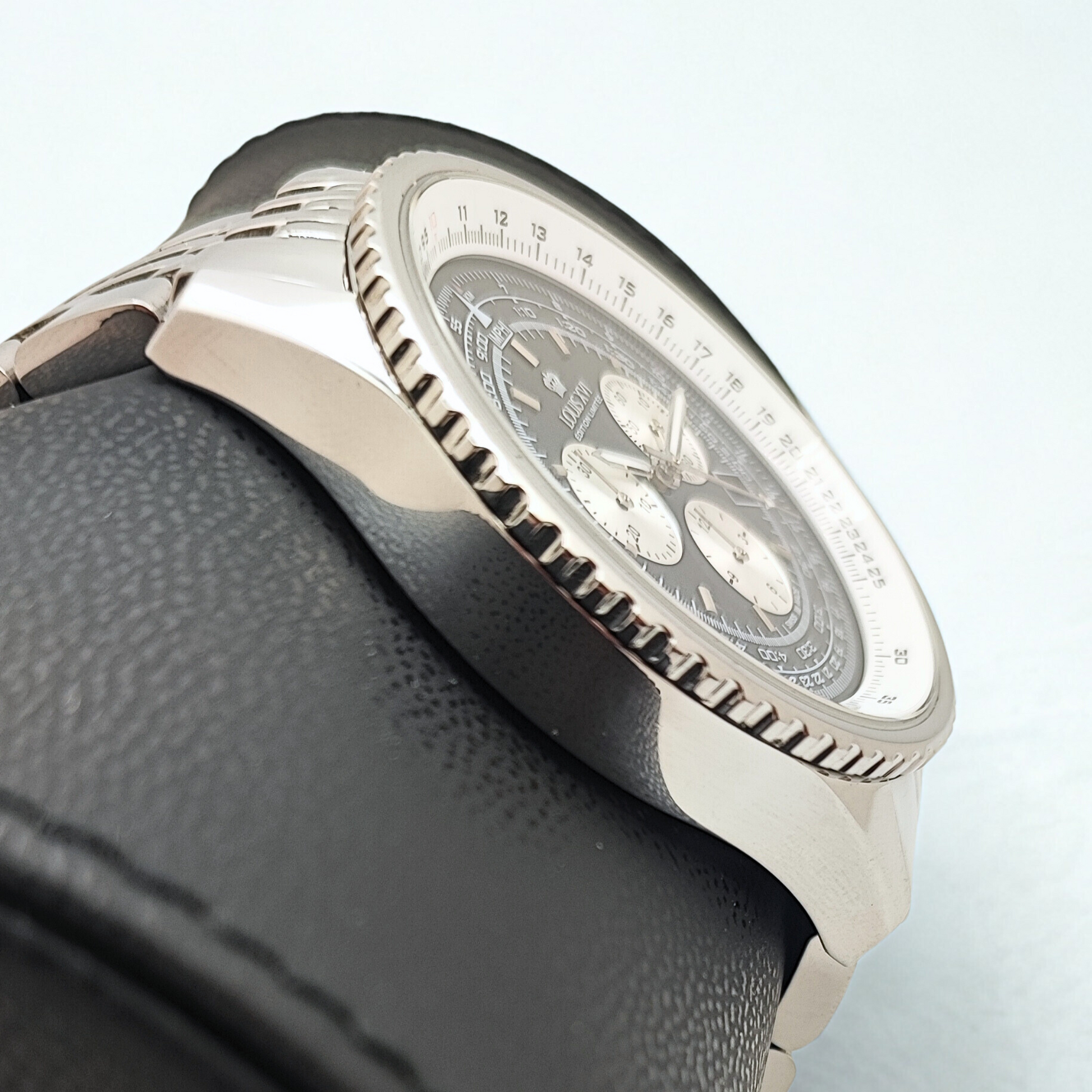 The black dial with silver chronograph sub-dials gives the watch an elegant yet sporty look. Fine details such as the precise baton indices, date display, and tachymeter scale highlight its luxurious character.