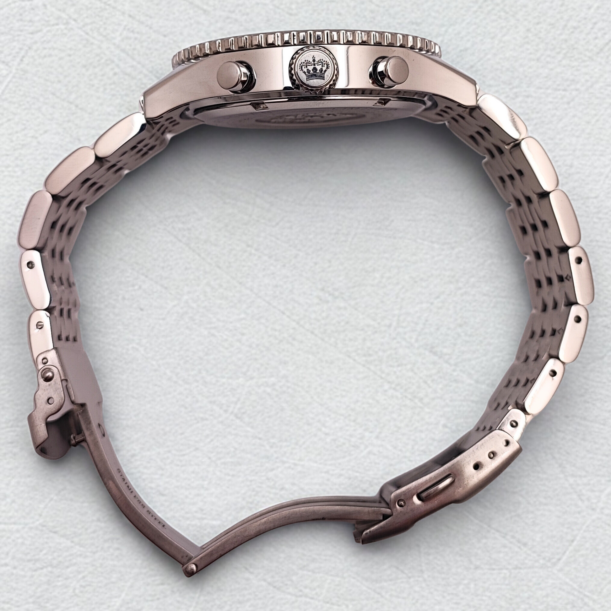 Diese Uhr stammt aus unserer Second Chance-Kategorie und wurde von uns sorgfältig geprüft. Sie befindet sich in nahezu neuwertigem Zustand mit nur minimalen Tragespuren (siehe Bilder). Das Gehäuse zeigt so gut wie keine Gebrauchsspuren (9/10), Das Armband hat nicht mehr als normale Gebrauchsspuren (9/10), das Glas ist nahezu makellos (9/10), das Zifferblatt und Uhrwerk befinden sich in einwandfreiem Zustand (10/10).